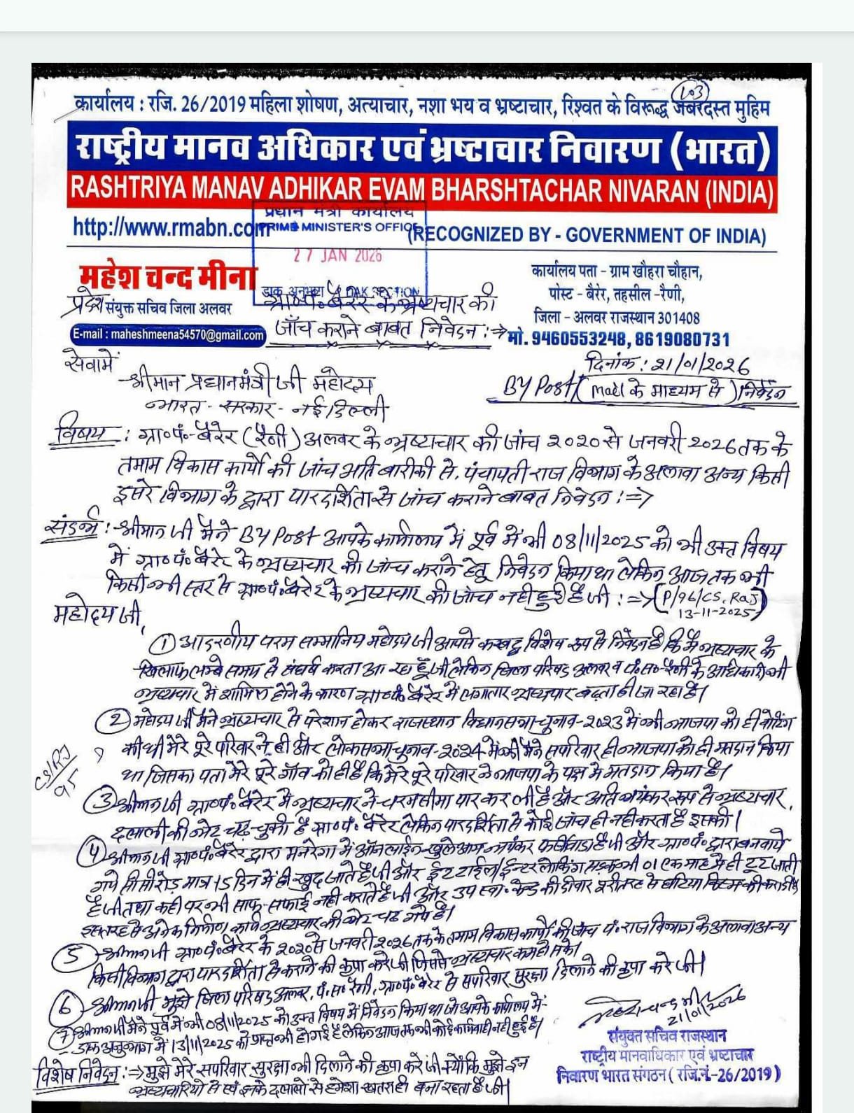 रैणी उपखण्ड की ग्राम पंचायत बैरेर में विकास कार्यों में भ्रष्टाचार के आरोप, कार्यवाही नहीं होने से ग्रामीणों में रोष!