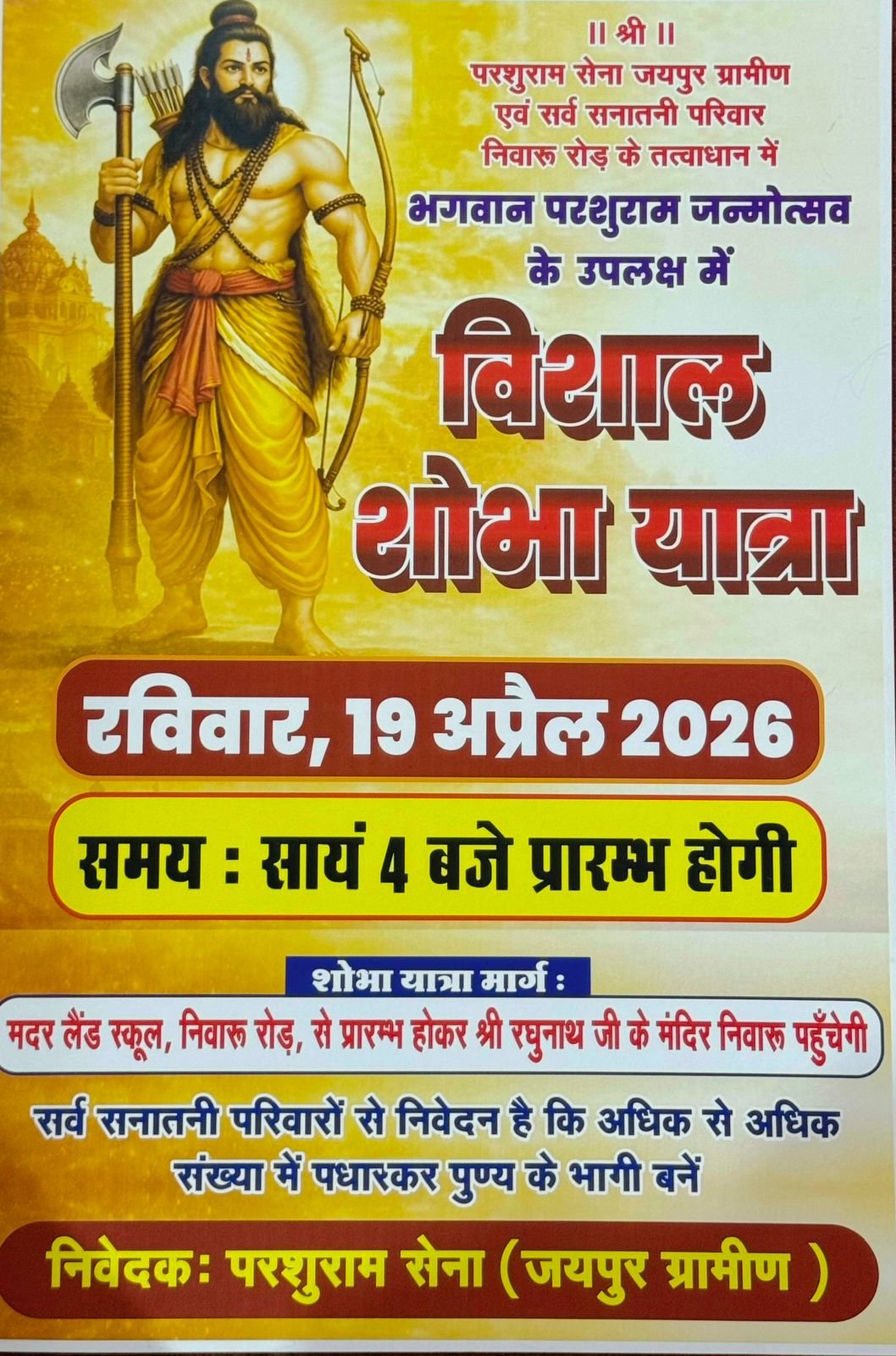 निवारू जयपुर ग्रामीण में परशुराम जन्मोत्सव पर निकलेगी विशाल शोभायात्रा, 19 अप्रैल को सायं ०4 बजे से होगी शुरुआत।