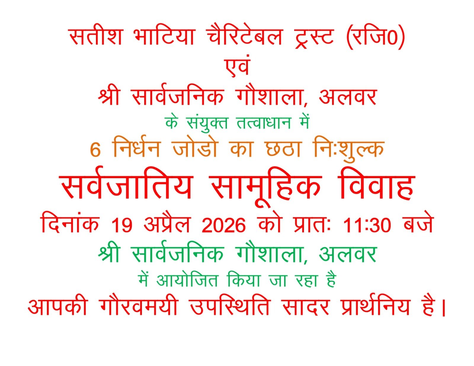 अलवर में 19 अप्रैल को ०6 निर्धन जोड़ों का निःशुल्क सर्वजातीय सामूहिक विवाह