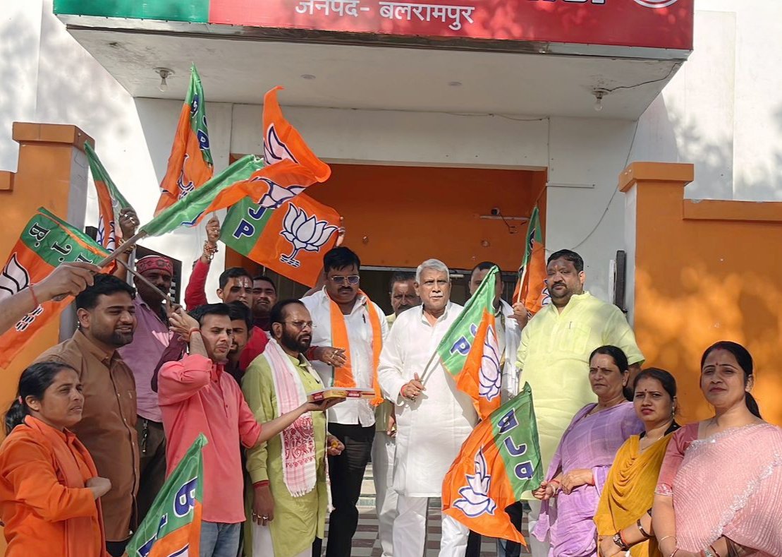 बिहार में पहली बार भाजपा का मुख्यमंत्री बनने पर जश्न, बलरामपुर में बांटी गई मिठाई