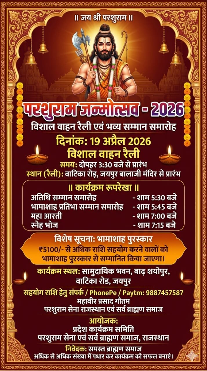 जयपुर: परशुराम जन्मोत्सव पर 19 अप्रैल को निकलेगी विशाल वाहन रैली, भव्य सम्मान समारोह का आयोजन।